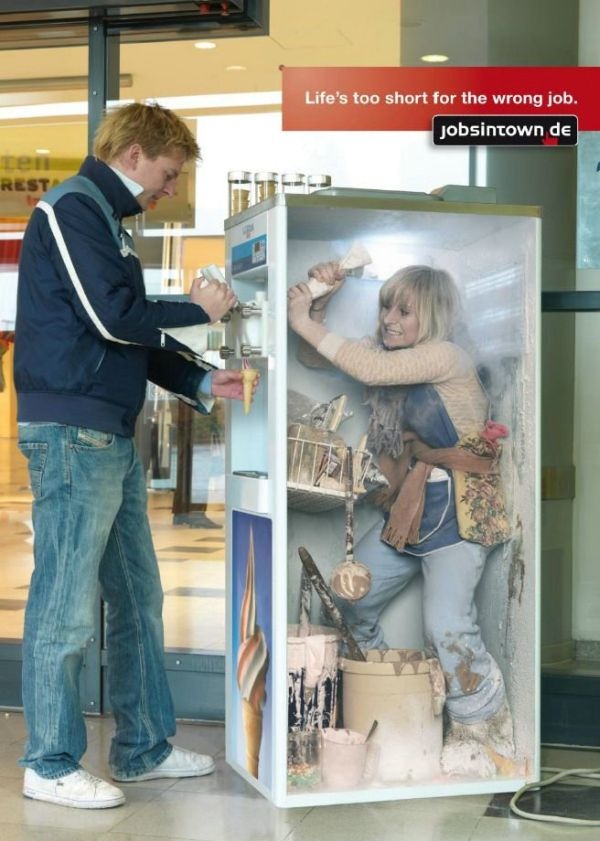At the 2007 International Andy Awards, held in New York on April, this Scholz & Friends campaign for a German job seekers' site took gold for the best campaign in the big print/outdoor category. JobsInTown.de’s creative posters were affixed to the sides of ATMs, vending machines and photo booths in high-traffic metro stations to the amusement of onlookers.